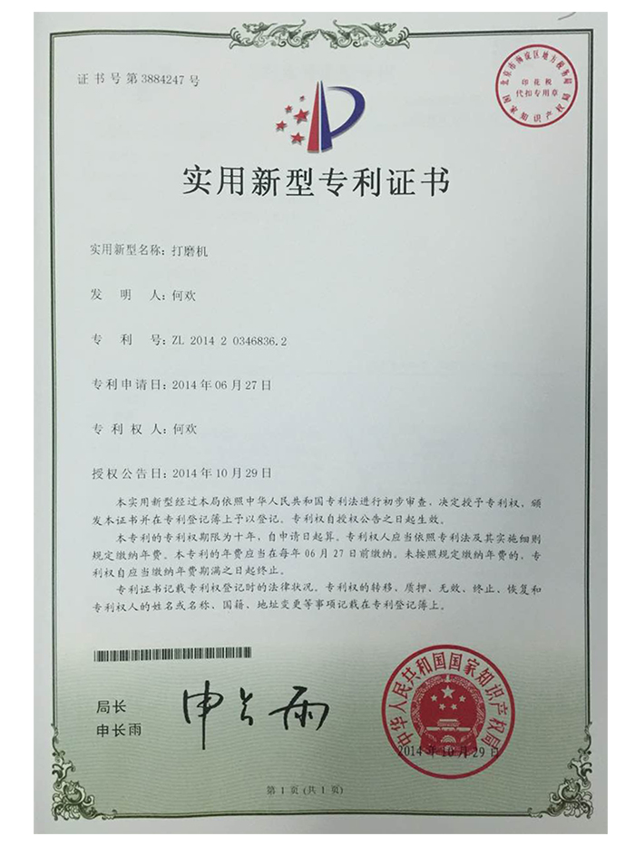 打磨機專利證書